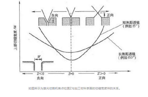 把焦點在加工材料表面上的狀態(tài)設(shè)為z=o“零”,焦點位置向上方移動時用“+”、向下方移動時用“-”來表示,移動量用mm表示。焦點在焦點位置z=o處上部切縫寬度W為最小。不論焦點位置是向上移還是向下移,上部的切縫寬度W都會變寬。